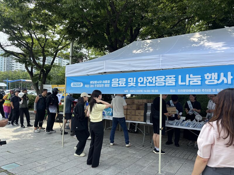인천시 남동구는 최근 인천문화예술회관 주차장에서 쿠팡이츠 서비스와 협업해 배달업 종사자 200여 명을 대상으로 온열질환 예방을 위한 음료 및 안전용품 나눔 행사를 개최했다고 4일 전했다.