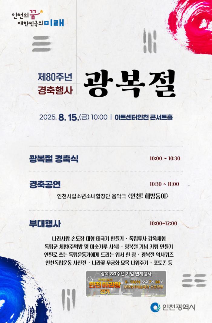 인천시는 오는 15일 아트센터 인천에서 광복 80주년을 기념하는 경축행사를 개최한다고 11일 밝혔다.