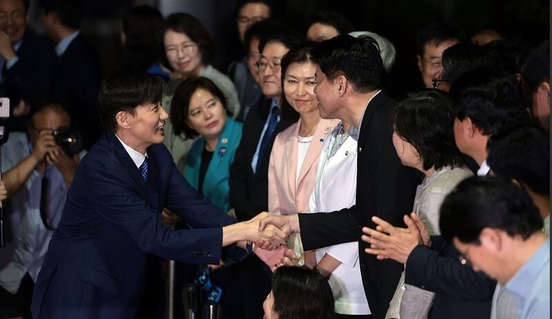 이날 남부교도소 앞에는 조국혁신당 의원 전원과 지지자들이 집결해 조 전 대표의 이름을 반복해 외치며 환호했다.