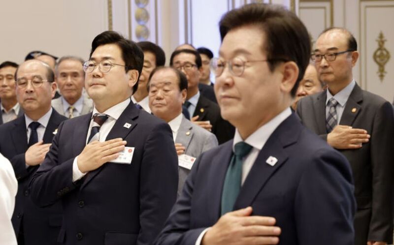 이재명 대통령이 서울 세종대로 광화문광장에서 열린 '광복 80년, 국민 주권으로 미래를 세우다' 제21대 대통령 국민 임명식에서 박찬대 더불어 민주당 의원과 악수를 하고 있다.