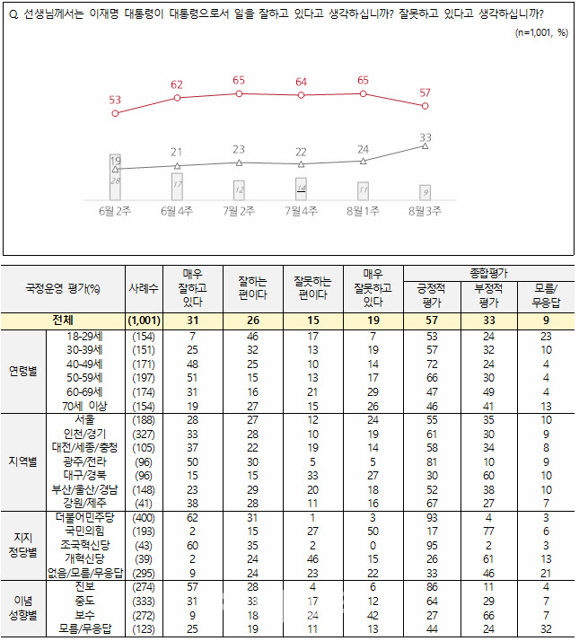 엠브레인퍼블릭·케이스탯리서치·코리아리서치·한국리서치가 지난 18~20일 전국 만 18세 이상 남녀 1001명을 대상으로 진행한 전국지표조사(NBS) 결과에 따르면 이 대통령의 국정 운영에 대해 ‘잘하고 있다’는 긍정적 평가는 57%, ‘잘못하고 있다’는 부정적 평가는 33%였다.