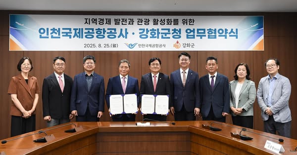 인천국제공항공사는 지난 25일 공사 회의실에서 강화군과 '공항 인근지역 관광 활성화 및 지역경제 발전 협력을 위한 업무협약'을 체결했다고 26일 밝혔다.