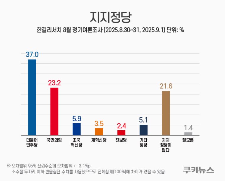 이어 조국혁신당 5.9%, 진보당 2.4%, 개혁신당 3.5%, 기타 정당 5.1%로 조사됐다. 지지정당이 없다고 응답한 무당층은 21.6%였다.지역별로는 호남권에서 민주당 지지율이 64.7%로 가장 높았다.