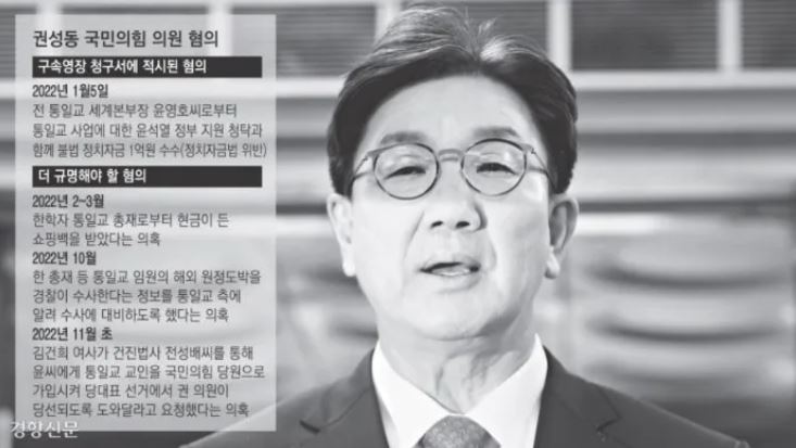 권 의원은 2022년 1월 통일교 전 세계본부장 윤모씨(구속기소)로부터 20대 대선에서 통일교 교인의 표와 조직, 재정 등을 제공하는 대신 윤 전 대통령 당선 후 통일교 현안을 국가 정책으로 추진해달라는 등의 청탁과 함께 1억원을 수수한 혐의(정치자금법 위반)를 받는다.