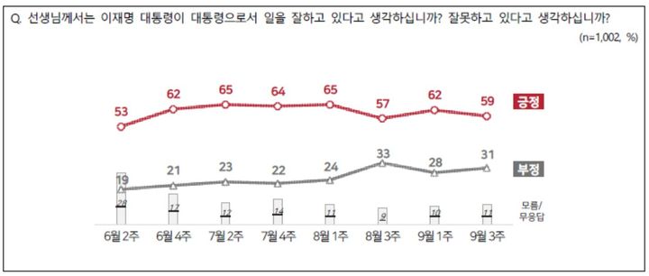 이재명 대통령의 국정 운영 지지도가 59%를 기록했다는 여론 조사 결과가 18일 나왔다엠브레인퍼블릭·케이스탯리서치·코리아리서치·한국리서치가 15~7일 만 18세 이상 남녀 1002명을 대상으로 한 9월 3주차 전국지표조사(NBS) 결과에 따르면