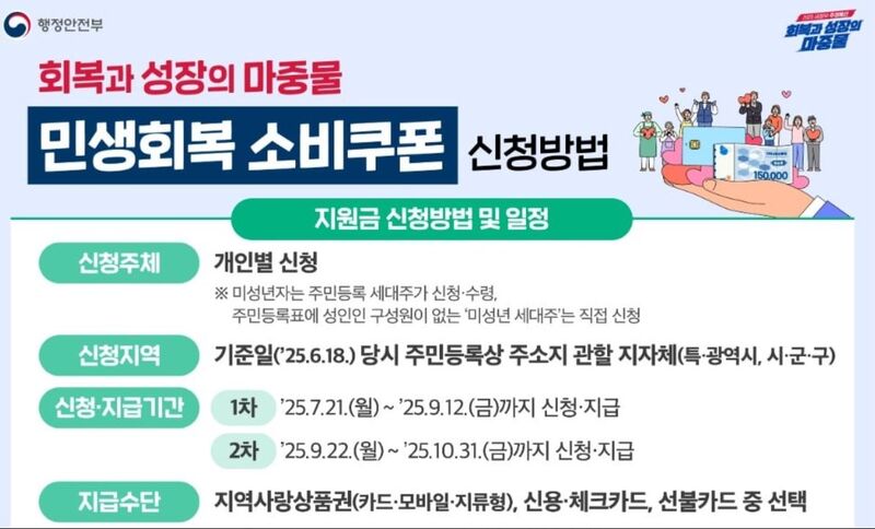 이밖에 추가 문의는 정부민원안내콜센터(국민콜110), 민생회복 소비쿠폰 전담 콜센터(☎1670-2525), 각 지방자치단체 콜센터에서 할 수 있다.
