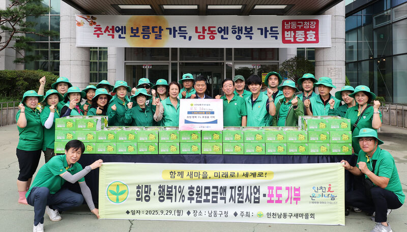 인천 남동구 새마을회(회장 전영선)가 연간 적립된 1% 나눔 후원금을 통해 물품을 구매해 지역의 소외계층에 전달하는 희망·행복 1% 후원 물품 기탁식을 29일 박종효 남동구청장에게 전달했다.