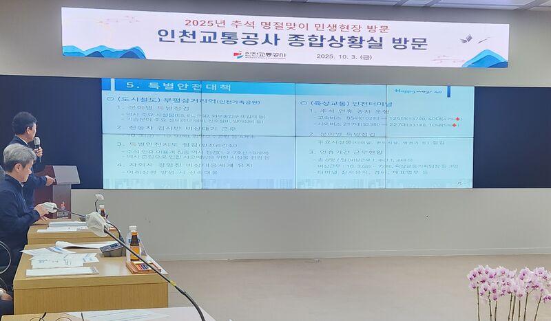 신동섭 시의원 유정복 인천시장 추석 연휴 시민 생활과 밀접한 인천교통공사 현장 점검에 나섰다. - 신동섭 시의원는 추석 연휴 동안 시민들이 안전하고 편안한 명절을 보낼 수 있도록 인천교통공사 관계자들에게 “실시간 상황 모니터링과 민원 처리 강화를 통해 추석 연휴에 시민 불편을 최…