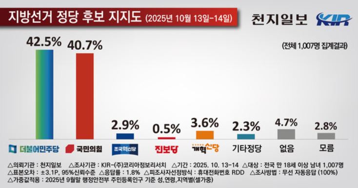 천지일보가 여론조사기관 코리아정보리서치에 의뢰해 지난 13~14일 전국 만 18세 이상 남녀 1007명을 대상으로 실시한 여론조사 결과 민주당 후보를 뽑겠다는 응답은 42.5%, ‘국민의힘 후보를 뽑겠다는 답변은 40.7%로 조사됐다이어 개혁신당 3.6%, 조국혁신당 2.9%, 진보당 0.5%, 기타정당 2.3%, 지지정당 없음 4.7%, 모름 2.8% 순이었다.
