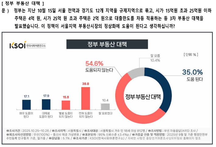 이번 조사 결과는 앞서 정부가 내놓은 10·15 부동산 대책이 일부 영향을 미친 것으로 보인다. 실제로 응답자의 54.6%는 이번 부동산 정책이 서울지역 부동산시장의 정상화에 ‘도움이 되지 않는다’고 답했다. ‘도움이 된다’(35.0%)는 응답자보다 약 20%포인트 높은 수치다.