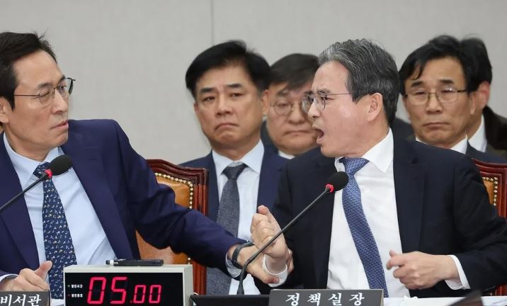 이 과정에서 민주당 원내대표인 김병기 위원장은 5차례 넘게 김 실장을 불렀지만 멈추지 않자 "여기가 정책실장 화내는 곳이냐"고 목소리를 높이자 김 실장은 그제야 "송구하다"며 그쳤다.
