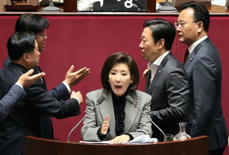 우 의장은 연단에 복귀한 나 의원이 국회의장을 향한 인사를 또 건너뛰었다고 지적했고, 국민의힘은 발언권 박탈에 대한 재발 방지 약속과 사과부터 하라며 맞받았다. 그러자 민주당 의석에서는 "내란 동조 정당", "적반하장" 등의 비난이 터져 나왔다.