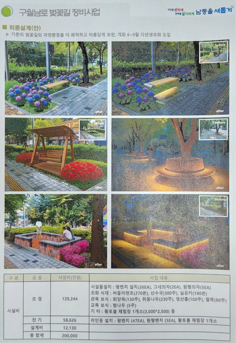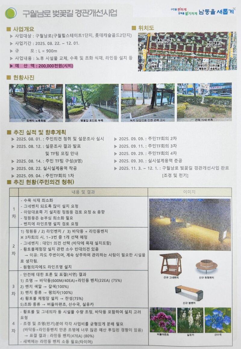 구월동 구월남로 경관 조명사업을 통해 평벤치.그네의자.원형의자 등 33개의 벤치를 새롭게 설치하고, 버들마편초.산수국.실유카 등 다년생 초화를 더해 사계절 내내 경관을 유지할 수 있도록 했으며, 라인조명 47개를 도입해 야간 보행 안전성을 크게 높였고, 황토볼 체험장을 신설해 가족들이 즐길 수 있는 체험공간도 확대했다.