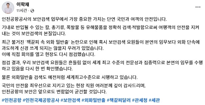 이학재 사장은 이날 페이스북을 통해 “기내로 반입될 수 있는 칼, 총기류, 폭발물 등 유해물품을 정확히 검색·적발함으로써 여행객의 안전을 지켜내는 것이 보안검색의 본질”이라며 이같이 말했다.