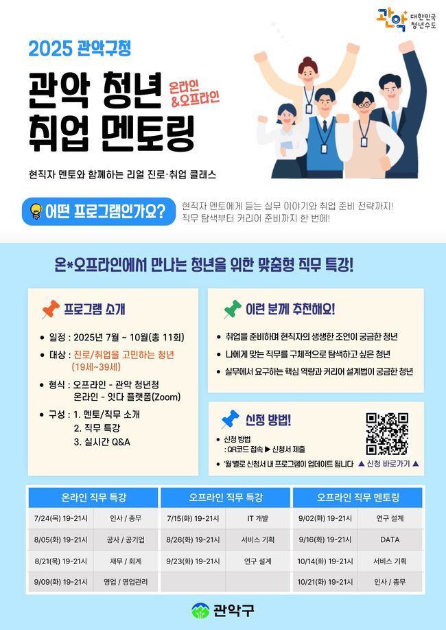 관악구, `2025 청년 취업멘토링` 확대 개편...7월 15일부터 운영 2012년 삼성전자의 재능기부로 시작된 이 사업은 13년간 청년층으로부터 꾸준한 호응을 얻어왔으며, 올해는 기업군과 직무 분야를 다변화해 보다 폭넓은 취업 정보를 제공할 계획이다. 특히 기존의 전자·기술 분야 중심에서 벗어나 다양한 산업군 현직자들이 멘토로 참여하는 것이 특징이다.