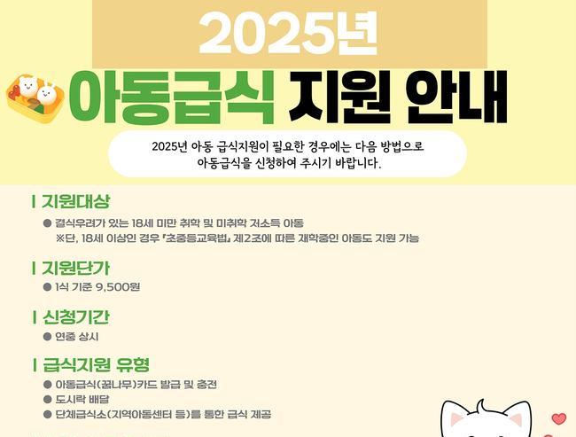 특히 올해는 물가 상승과 외식비 부담을 고려해, 아동급식 단가를 기존 9,000원에서 9,500원으로 인상해 아동들에게 보다 질 높은 식사를 지원할 수 있도록 했다.
