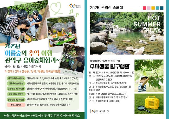 한편 관악산 숲속 생태체험관에서는 숲속 생태계와 자연환경에 대해 배우고 체험하는 `숲 해설` 프로그램을 운영한다. 이번 여름에는 관악구 대표 피서지로 꼽히는 신림 계곡에서 수서곤충을 관찰하고 물을 활용한 생태놀이를 체험할 수 있다.