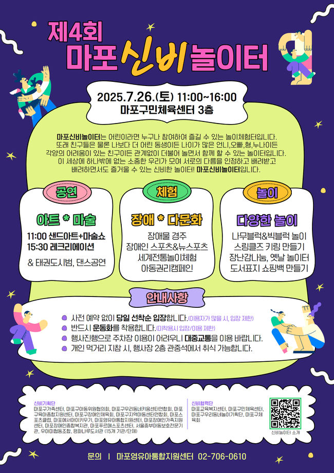2025 제4회 마포신비놀이터 포스터.‘마포 신비놀이터’는 장애·비장애, 다문화 등 다양한 배경의 아동이 차별 없이 어울려 놀이로 하나 되는 통합형 아동 놀이문화 행사로, 올해는 ‘달라서 빛나는 우리, 우리 모두는 소중해’를 슬로건으로 개최된다.