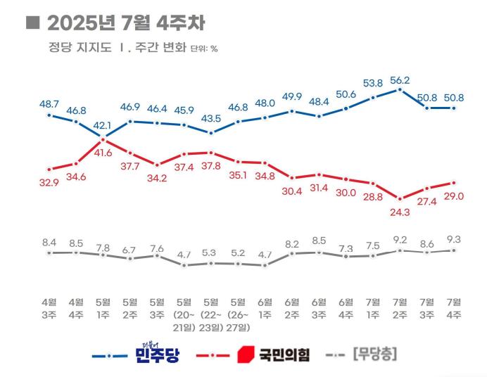 정당 지지도 조사(74주차)에선 더불어민주당이 50.8%, 국민의힘이 29.0%를 각각 기록한 것으로 집계됐다정당 지지도 조사는 지난 24~25일 전국 18세 이상 유권자 1005명을 대상으로 진행됐다. (신뢰수준 95%, 표본오차 ±3.1%p)