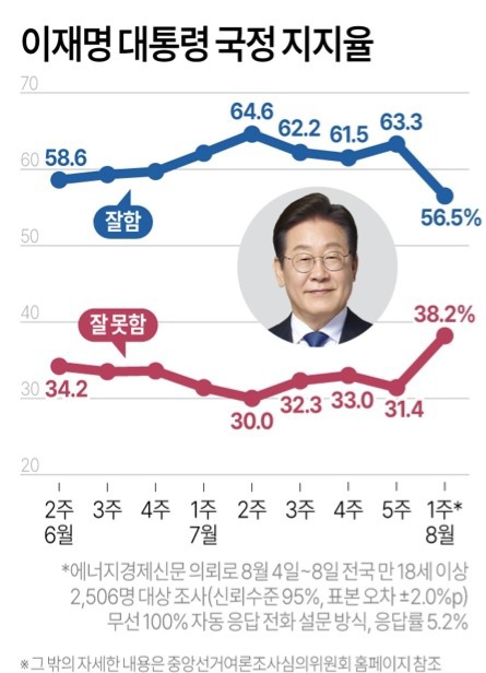 이재명 대통령의 국정수행 지지도가 56.5%로 취임 후 최저치를 기록했다는 여론조사 결과가 11일 나왔다.
