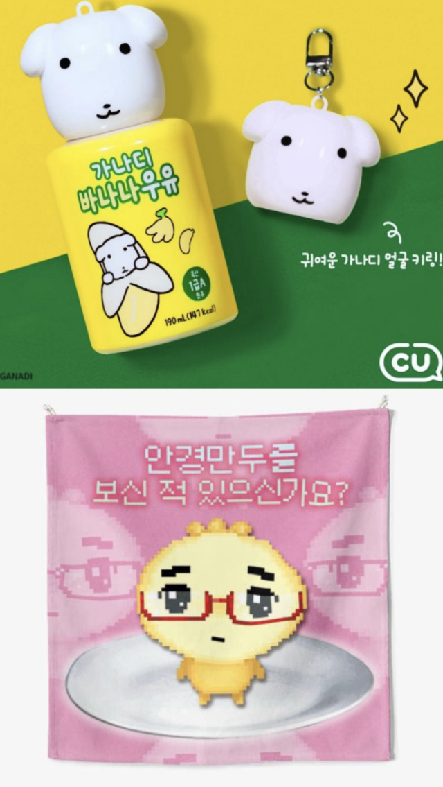 ‘듀.. 가나디’와 편의점 CU가 협업한 ‘가나디 바나나우유’는 없어서 못 사 먹는 아이템이 됐다. 제품 뚜껑이 가나디 얼굴 모양이고, 뚜껑 위에는 고리를 걸 수 있는 구멍이 나 있다.