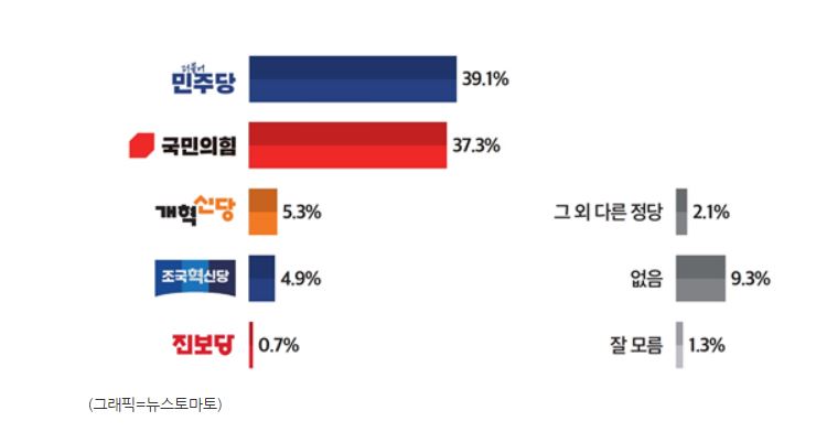 민주당 39.1% 국힘 37.3%, 격차 줄어[미디어토마토]
