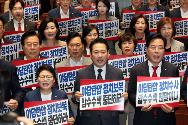 국민의힘이 조은석 특검의 원내대표실 압수수색 시도 저지를 위한 규탄 대회를 열고 정치보복 압수수색을 당장 중단하라고 촉구했다.