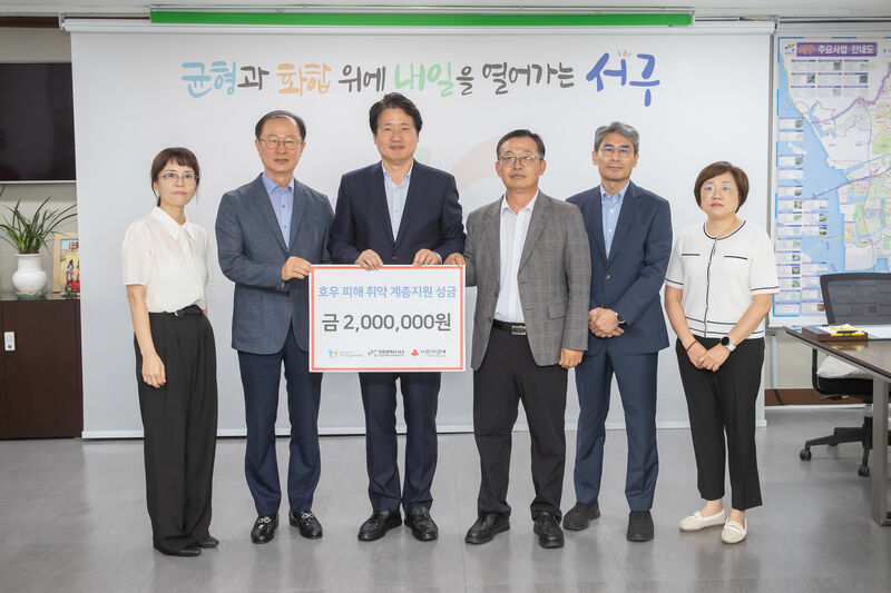 인천 서구(구청장 강범석)는 3일, 인천서구시설관리공단(이사장 우영환)이 호우피해 복구 성금 200만 원을 기부했다고 4일 밝혔다.