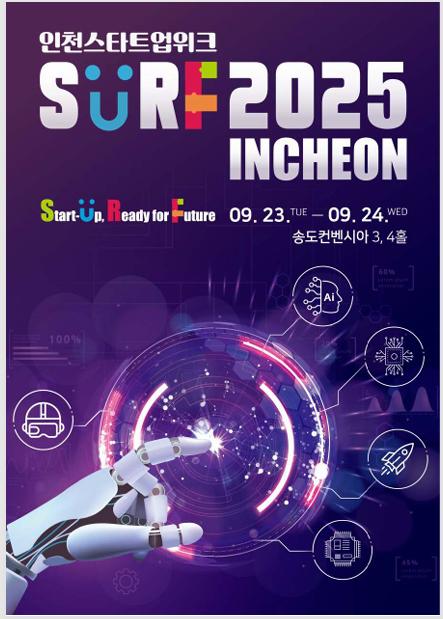인천광역시(시장 유정복)는 오는 9월 23일부터 24일까지 이틀간 송도컨벤시아 3, 4홀에서 인천의 대표적인 신생기업 축제 'SURF 2025 INCHEON'을 개최한다고 밝혔다.