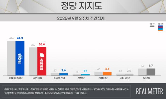 정당지지도 조사 결과는 민주당 44.3%, 국민의힘 36.4%, 개혁신당 4.4%, 조국혁신당 2.6%, 진보당 1.5% 순으로 나타났다. 무당층은 8.7%로 집계됐다.