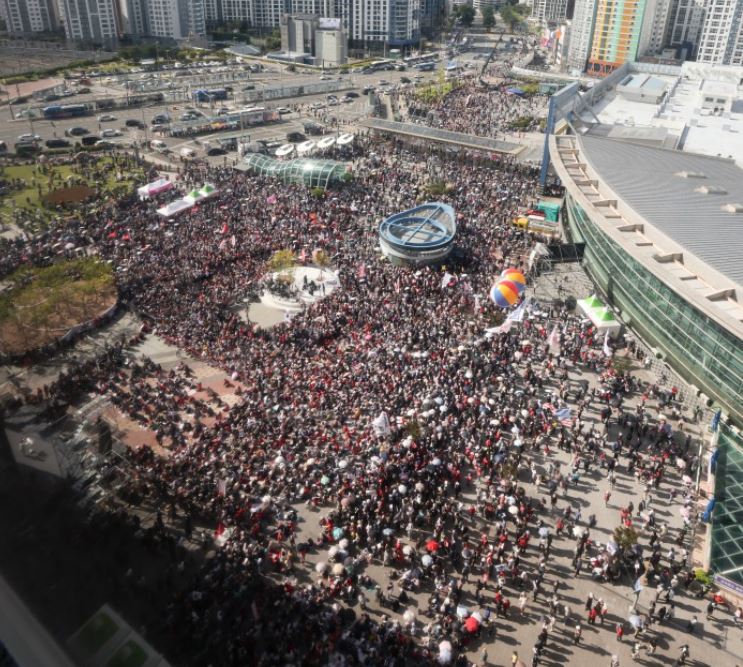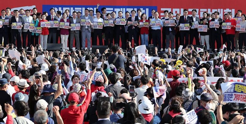 국민의힘이 21일 무려 5년 만에 장외투쟁에 나섰다당 추산으로 7만명의 당원과 시민들이 모여 이재명 정부와 더불어민주당을 향한 힐난을 쏟아냈다