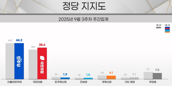 지난 18∼19일 전국 18세 이상 유권자 1천7명을 대상으로 한 정당 지지도 조사에서는 더불어민주당이 44.2%, 국민의힘이 38.6%로 각각 집계됐다.