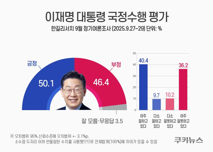 1일 여론조사 전문기관 한길리서치가 쿠키뉴스 의뢰로 지난달 27일부터 29일까지 전국 만 18세 이상 남녀 1014명을 대상으로 실시한 이 대통령의 국정수행에 대한 긍정평가는 50.1%로 나타났다. 부정평가는 46.4%였으며 ‘잘 모르겠다’는 3.5%였다.