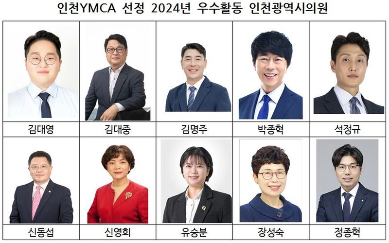 인천YMCA가 제9대 인천시의회 2024년 활동에 대한 모니터링을 진행해 우수 의원 10명을 선정했다고 1일 밝혔다.
