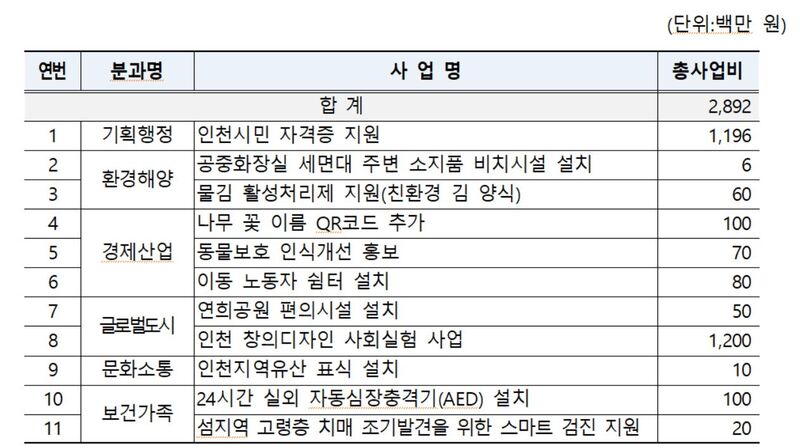 인천시, 주민참여예산 총회에서 28억 규모 11개 사업 선정 - 이번 총회에서 선정된 주요 사업은 ▲인천시민 자격증 지원 ▲24시간 실외 자동심장충격기(AED) 설치 ▲이동노동자 쉼터 설치 등이며, 총 사업 규모는 28억 9천2백만 원에 이른다.