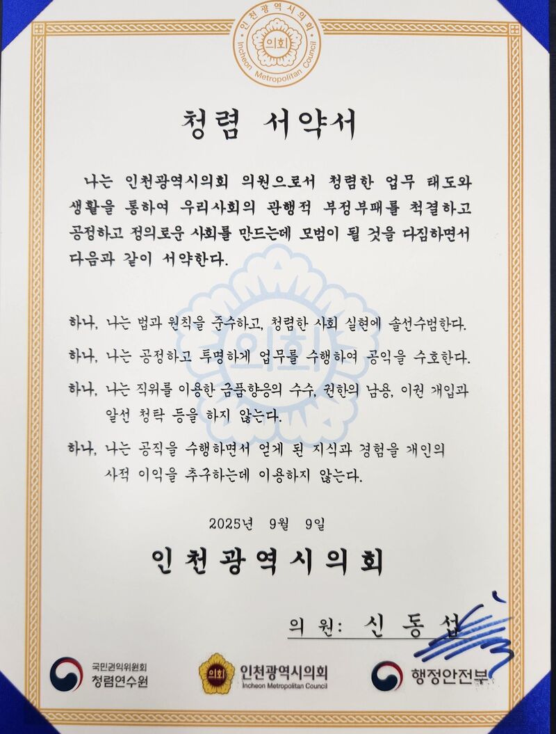 신동섭 시의원은 제9대 인천광역시의회 의원들이 청렴서약식에 참여했다고 밝였다. 신동섭 의원은 조례 제ㆍ개정, 예산 심의ㆍ의결 등 많은 권한을 가지고 있고,그 권한에 편승하여 많은 유혹이 있을 수 있습니다.