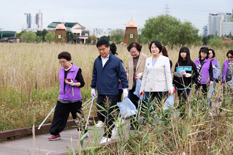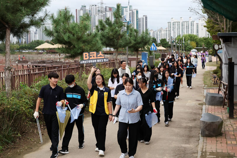 인천 남동구(구청장 박종효)2025.10.15.(소래습지생태공원에서 논현중학교 학생들과 함께 플로깅(조깅하며 쓰레기 줍기행사를 참여했다.