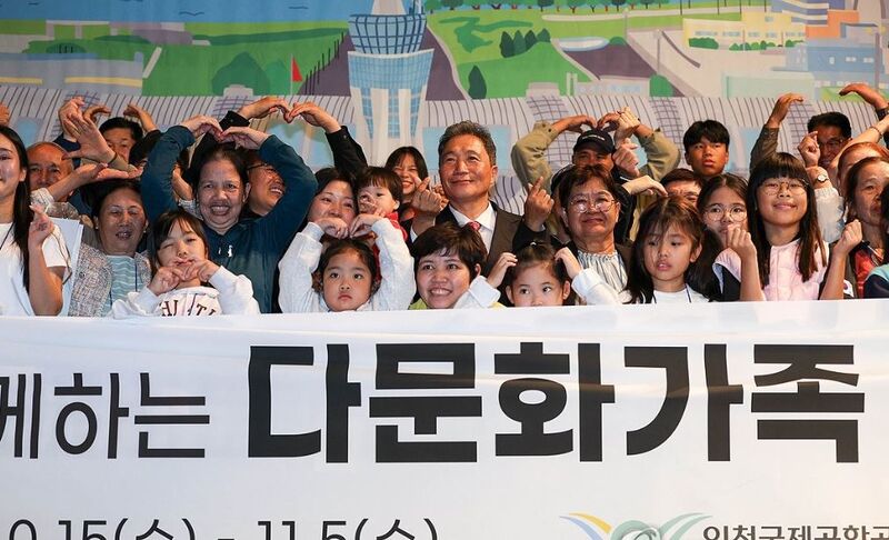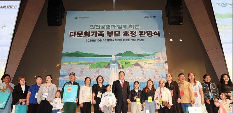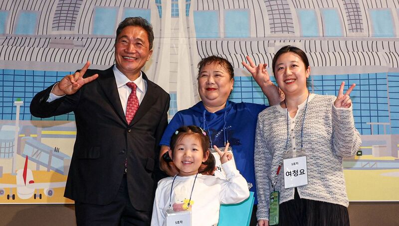이학재 인천국제공항공사 사장이 16일 인천 중구 인천국제공항공사 항공교육원에서 열린 '다문화가족 부모초청 환영행사'에서 참석자들과 기념촬영을 하고 있다.