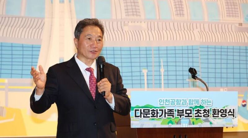 이학재 인천국제공항공사 사장이 인천 중구 인천국제공항공사 항공교육원에서 열린 '다문화가족 부모초청 환영행사'에 참석해 인사말 하고 있다.