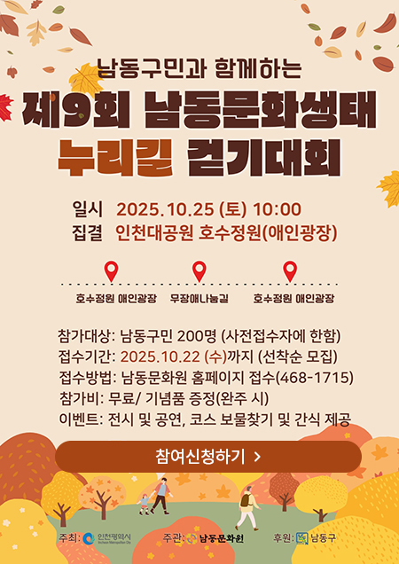 연간 400만 명 넘는 시민들이 찾는 공원. 이곳에서 남동문화원이 여러분을 '걷기대회'에 초대합니다.