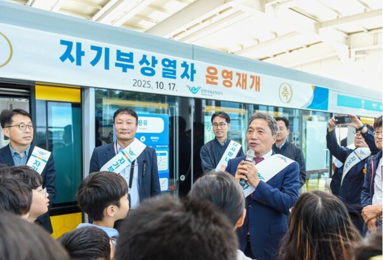인천공항공사는 지난 17일 용유역에서 인천공항 자기부상열차 운영재개 기념행사를 개최했으며 이 자리에는 이학재 사장권혁진 서울지방항공청장 등 관계자와 지역주민 약 백명이 참석해 자기부상열차의 운영 재개를 기념했다고 밝혔습니다.