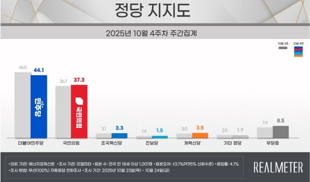 지난 23~24일 전국 18세 이상 1001명을 대상으로 한 정당 지지도 조사에서는 더불어민주당이 44.1%, 국민의힘이 37.3%로 집계됐다.