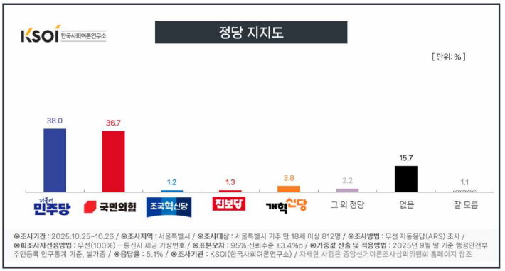 정당 지지율도 접전이었다. 조사에 응한 서울 유권자 38%는 더불어민주당을 지지했지만 36.7%는 국민의힘을 지지했다. 이어 개혁신당 3.8%, 진보당 1.3%, 조국혁신당 1.2%, 그 외 정당이 각각 2.2%를 기록했다. 지지 정당이 없는 무당(無黨)층은 15.7%였다.