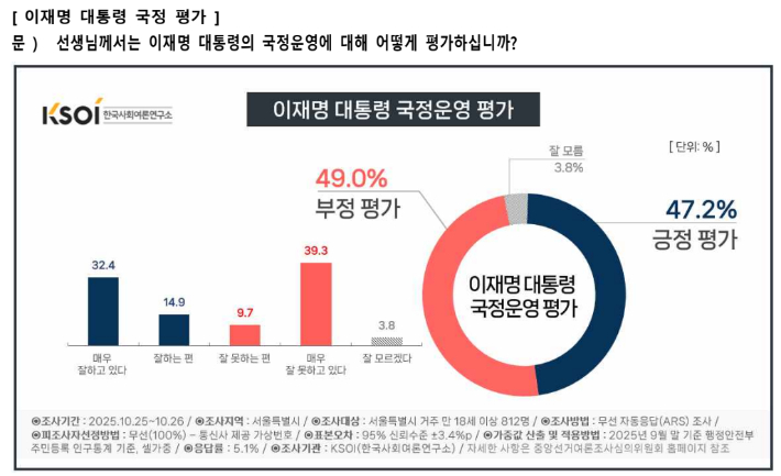 이재명 정부, 악화하는 ‘서울 민심’···‘李 잘못하고 있다’ 49% ‘잘하고 있다’ 47%-KSOI