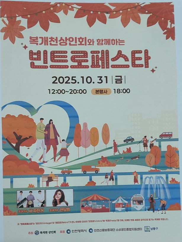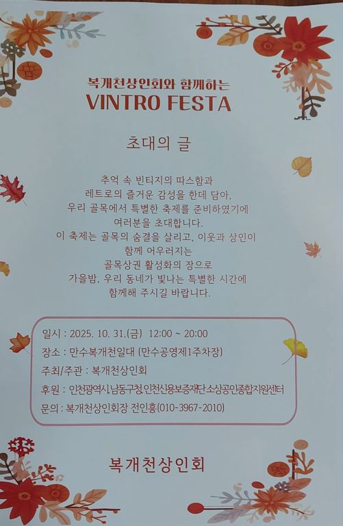 인천시 남동구 복개천 상인회(회장 전인흥) 10월 31일 금요일 12시부터 저녁 20시 00분까지 만수복개천 일대에서 ‘2025 복개천상인화와 함께 하는 “빈트로 페스타’를 운영한다고 밝혔다.