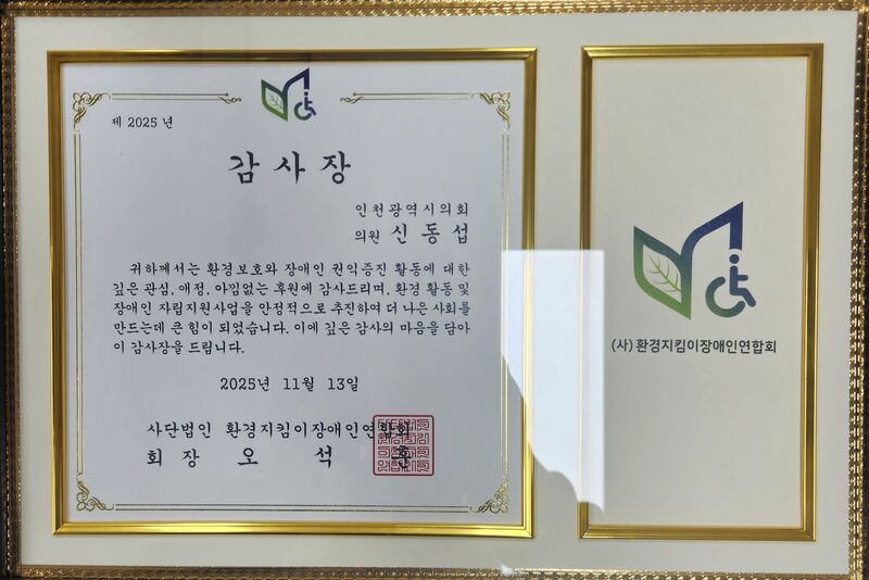 신동섭 시의원은 환경 보호와 장애인 권익증진에 기여한 공로로 지난 11월 13일 사)국제휘트니스연합회와 사)환경지킴이장애인 연합회로부터 감사패와 감사장을 각각 받았다.
