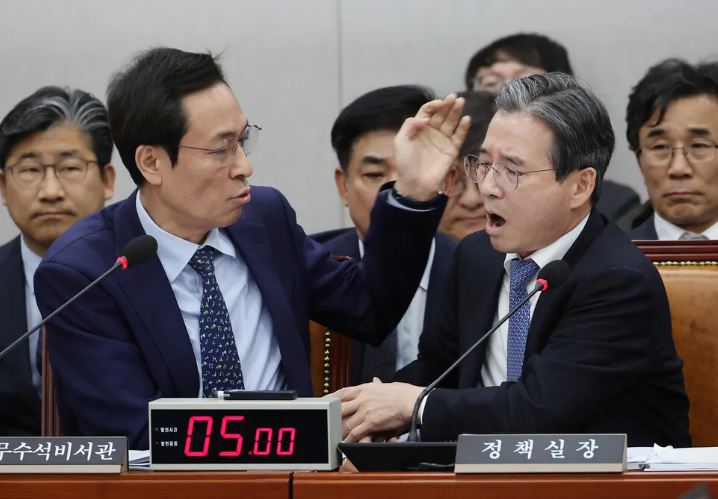 김용범 대통령실 정책실장이 18일 국회에서 야당 의원 질의에 고성으로 항의하다 더불어민주당 김병기 원내대표가 나서서 제지하는 일이 벌어졌다.