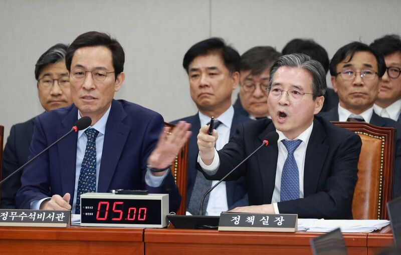 이 과정에서 민주당 원내대표인 김병기 위원장은 5차례 넘게 김 실장을 불렀지만 멈추지 않자 "여기가 정책실장 화내는 곳이냐"고 목소리를 높이자 김 실장은 그제야 "송구하다"며 그쳤다.