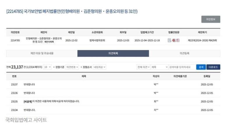국보법폐지법…입법 예고 사흘만 반대 7만건 “도 넘은 법안”