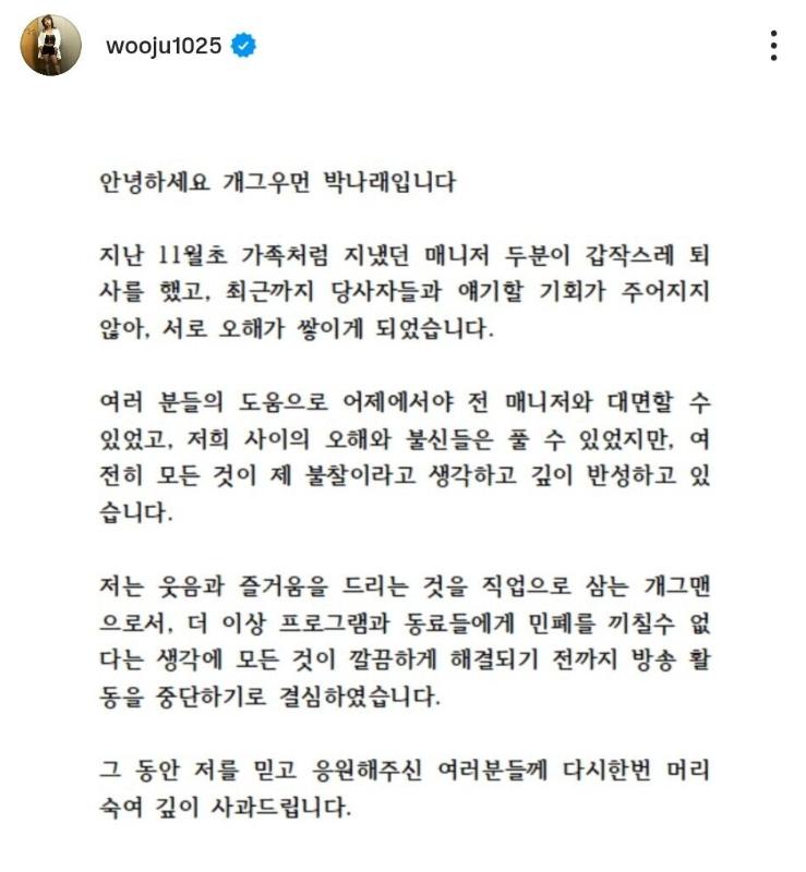 박나래는 "11월 초 가족처럼 지냈던 매니저 두 분이 갑작스레 퇴사했고, 최근까지 당사자들과 얘기할 기회가 주어지지 않아 서로 오해가 쌓이게 됐다"며 "어제서야 전 매니저와 대면할 수 있었고 저희 사이의 오해와 불신들을 풀 수 있었다"고 말했다.